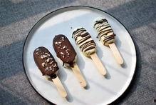 8. 裹脆皮:将巧克力块放在冰棒上,轻轻滚动,让冰棒表面裹上一层巧克力脆皮。